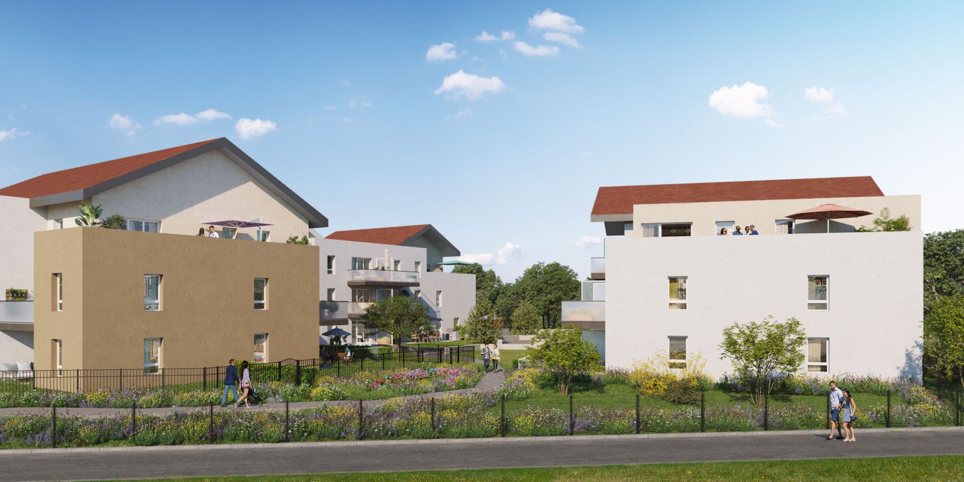 Le Clusoé se niche dans un terrain clôturé et bordé de haies arborées, avec son portail, ses entrées piétons et sa promenade grâce à laquelle chacun rejoint son chez-soi en toute sérénité.