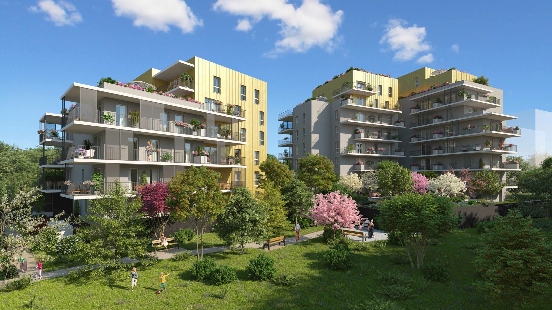 Construits en R+5 et R+8, les deux bâtiments bénéficient d’un trait architectural particulièrement remarquable. Léger, étagé en finesse, le bâti s’étale et se prolonge en vagues rectilignes du plus bel effet. Ici les terrasses et les balcons sont à l’honneur et profiteront totalement du panorama et du soleil des Alpes. Multipliant les belles expositions et dominant la canopée et le socle végétal, l’ensemble est agréable à l’œil et les venelles environnantes semblent inviter à en découvrir toutes les facettes. Un lieu de vie et de ville qui ne passera pas inaperçu dans ce très joli quartier.