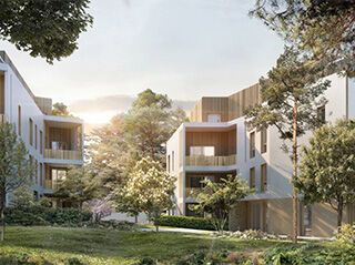 • Trois bâtiments de seulement 2 étages et leur attique suivent la pente douce du terrain en un ensemble harmonieux, parfaitement orienté.
