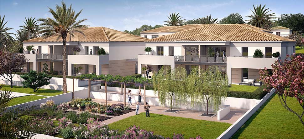 Non loin des pinédes de Bandol, le paysage immédiat profite également de poches de verdure, essences méditerrannéennes et palmiers domestiques se partageant les espaces plantés.